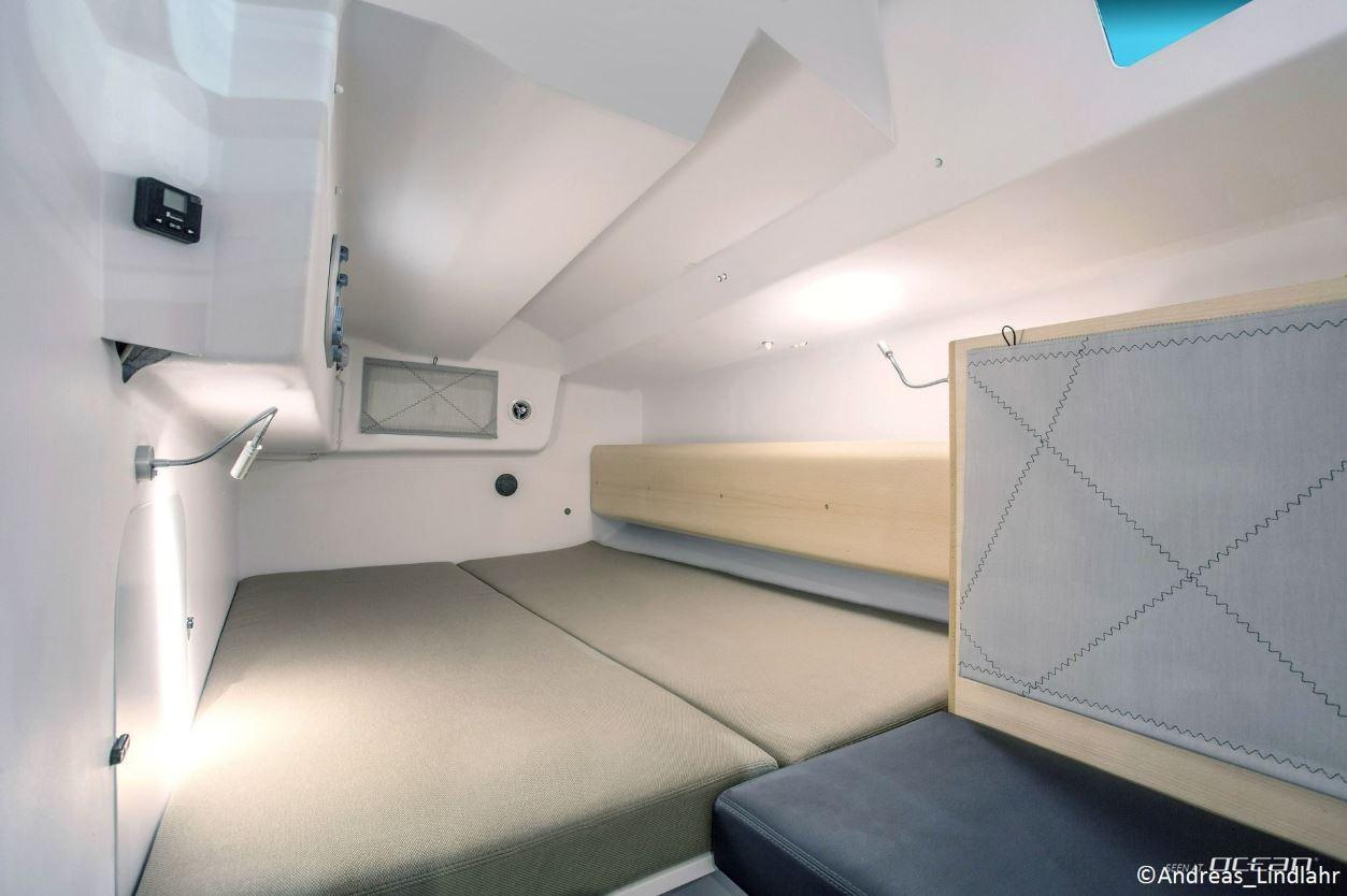 The deck layout is clean, functional, and optimized for short-handed performance sailing. A full set of sails includes an asymmetric spinnaker A2 and a gennaker Code 0, allowing flexible sail selection across different wind angles. Wide cockpit spaces, efficient control lines, and well-positioned deck hardware support confident handling whether crossing open stretches or maneuvering close to shore.