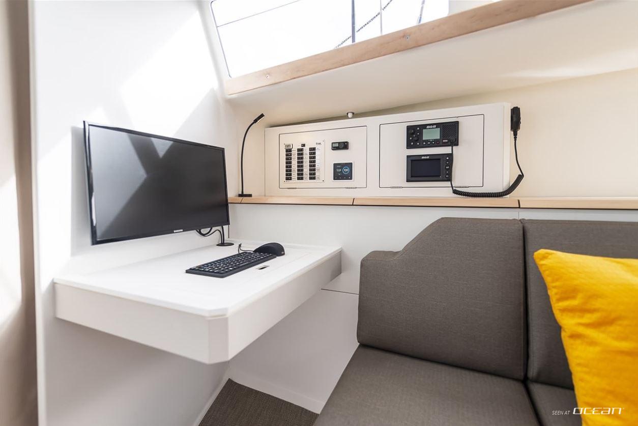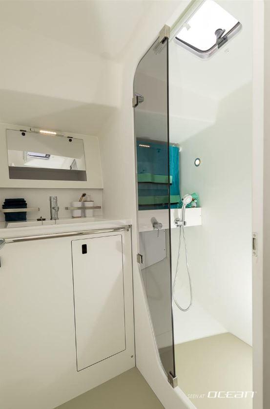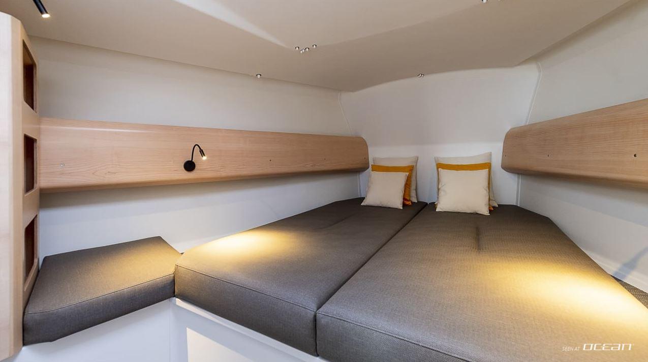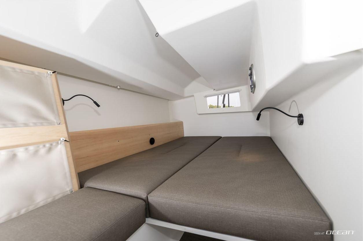 Below deck, our Pogo 44 offers generous interior volume for her size, accommodating up to 10 guests sleeping in 4 double cabins and 2 additional salon berths. The wide hull translates into comfortable cabins, a bright saloon, and practical storage throughout. The interior layout favors ventilation, simplicity, and durability, making her well adapted to active sailing programs.