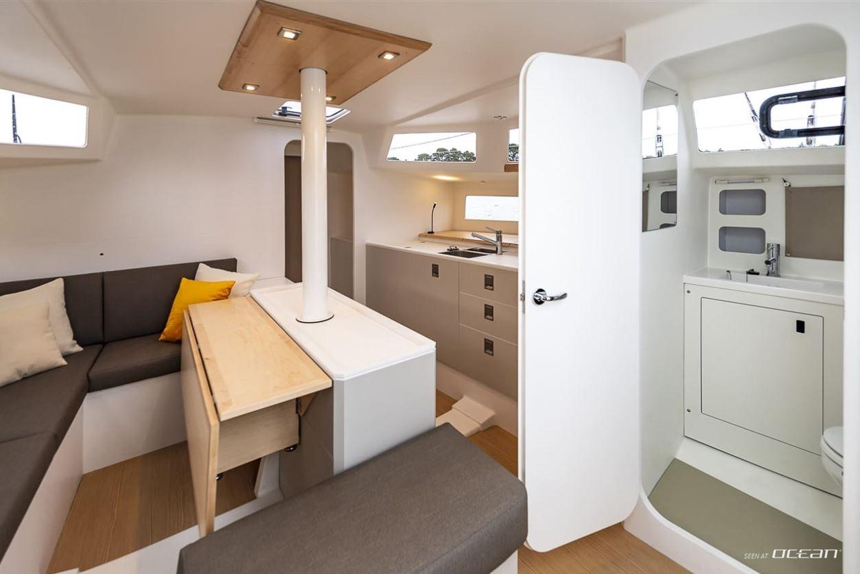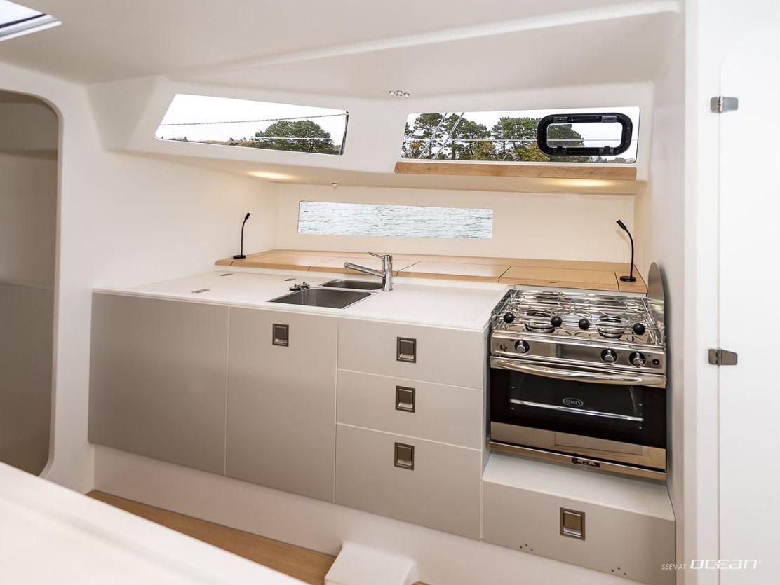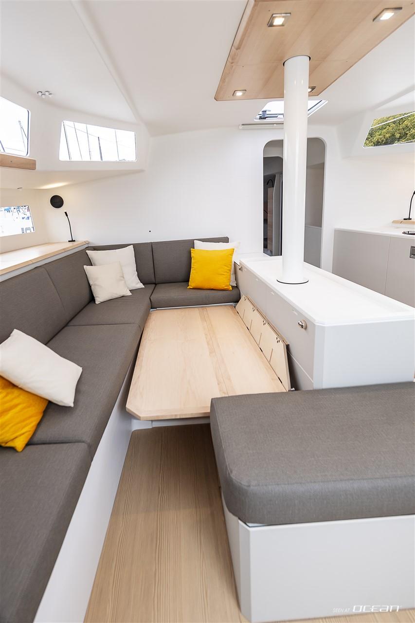 Below deck, our Pogo 44 offers generous interior volume for her size, accommodating up to 10 guests sleeping in 4 double cabins and 2 additional salon berths. The wide hull translates into comfortable cabins, a bright saloon, and practical storage throughout. The interior layout favors ventilation, simplicity, and durability, making her well adapted to active sailing programs.