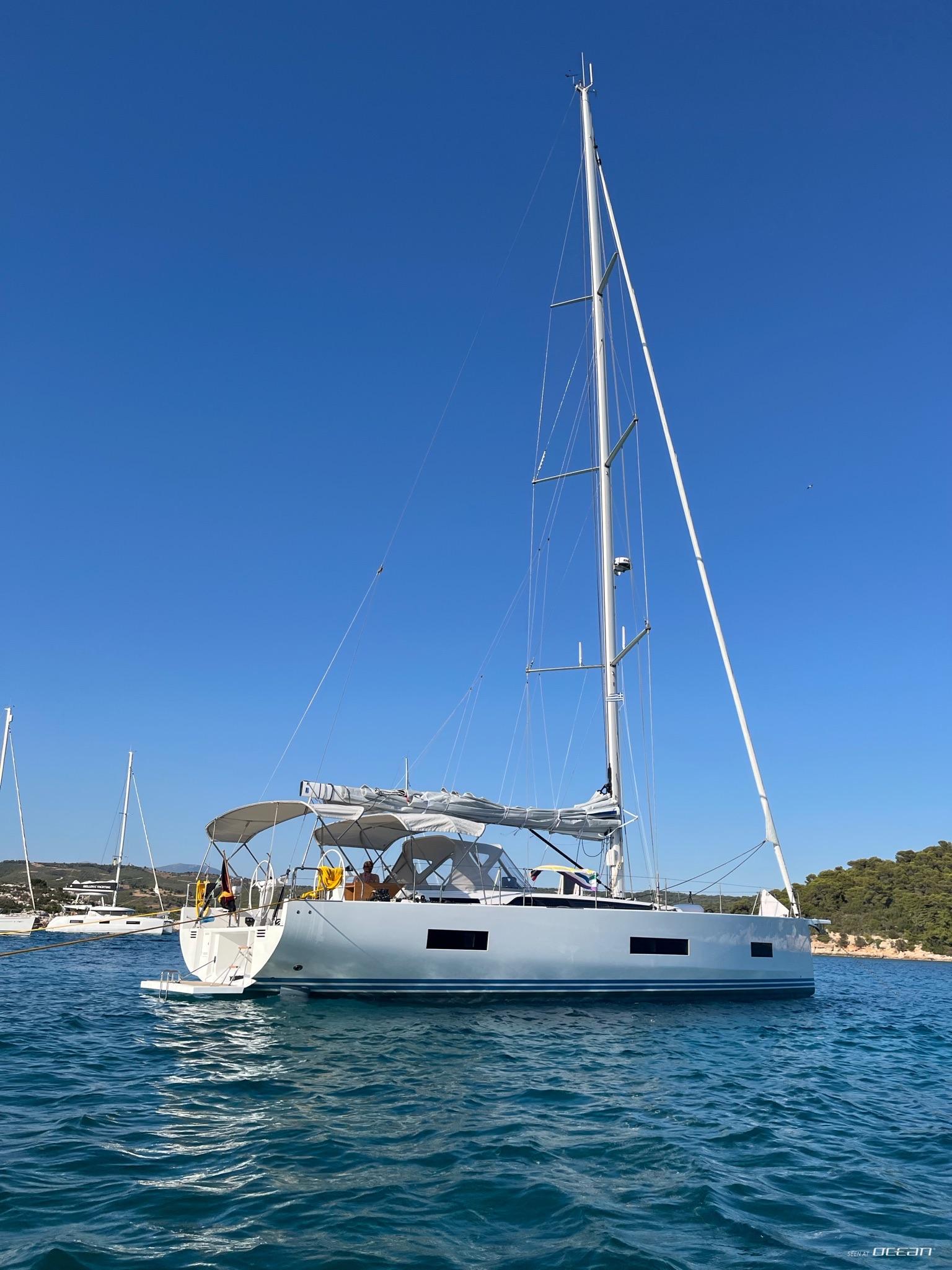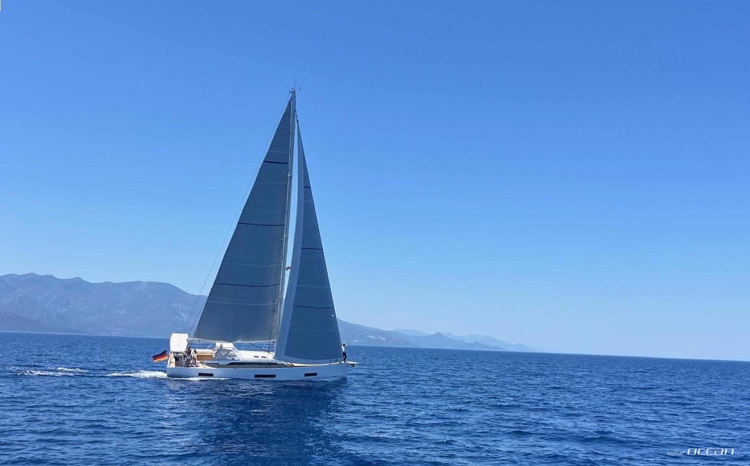 Sailing yacht charter Greece, Solaris 50 from Lavrion and Corfu (model 2025): North Sails 3Di Endurance wardrobe, full batten mainsail, furling genoa, furling jib on inner stay, running Gennaker, storm jib, bow thruster, 4 electric Harken Performa winches, carbon bow sprit, hydraulic vang, outhall & backstay, generator, air condition, electric toilets, watermaker, teak deck, teak cockpit, washing machine, folding propeller, B&G performance electronics, Nemesis mast foot instruments, 3 GPS screens, autopilot, cockpit cushions, Fusion music system, Wi-Fi, bimini, salon sofa with lifting system, sprayhood, electric windlass, cockpit/stern shower, bathing platform, stand-up paddleboard, dinghy with electric outboard engine, and all standard charter and safety equipment