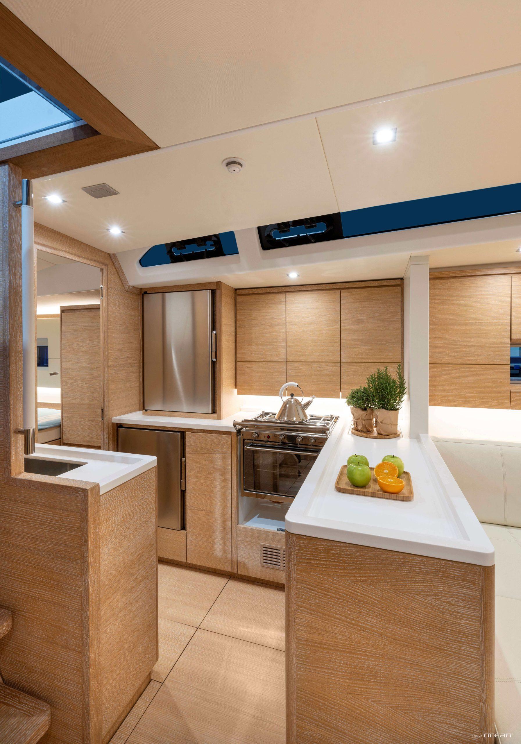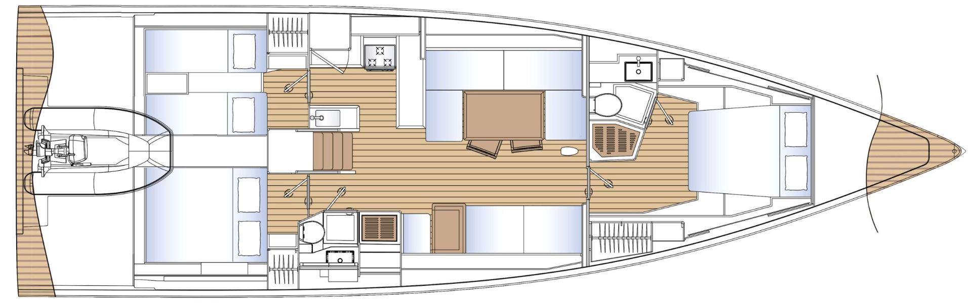 The interior layout features 3 double cabins, highlighted by a spacious master cabin forward, making the yacht best suited for up to 6 guests during a skipper-led charter. Thoughtful design prioritizes space, light, and practicality, creating a calm onboard atmosphere after active sailing days. Air conditioning, generator, watermaker, washing machine, Bluetooth sound system, and Wi-Fi internet ensure comfort without compromising sailing character.