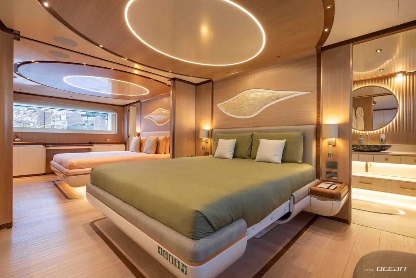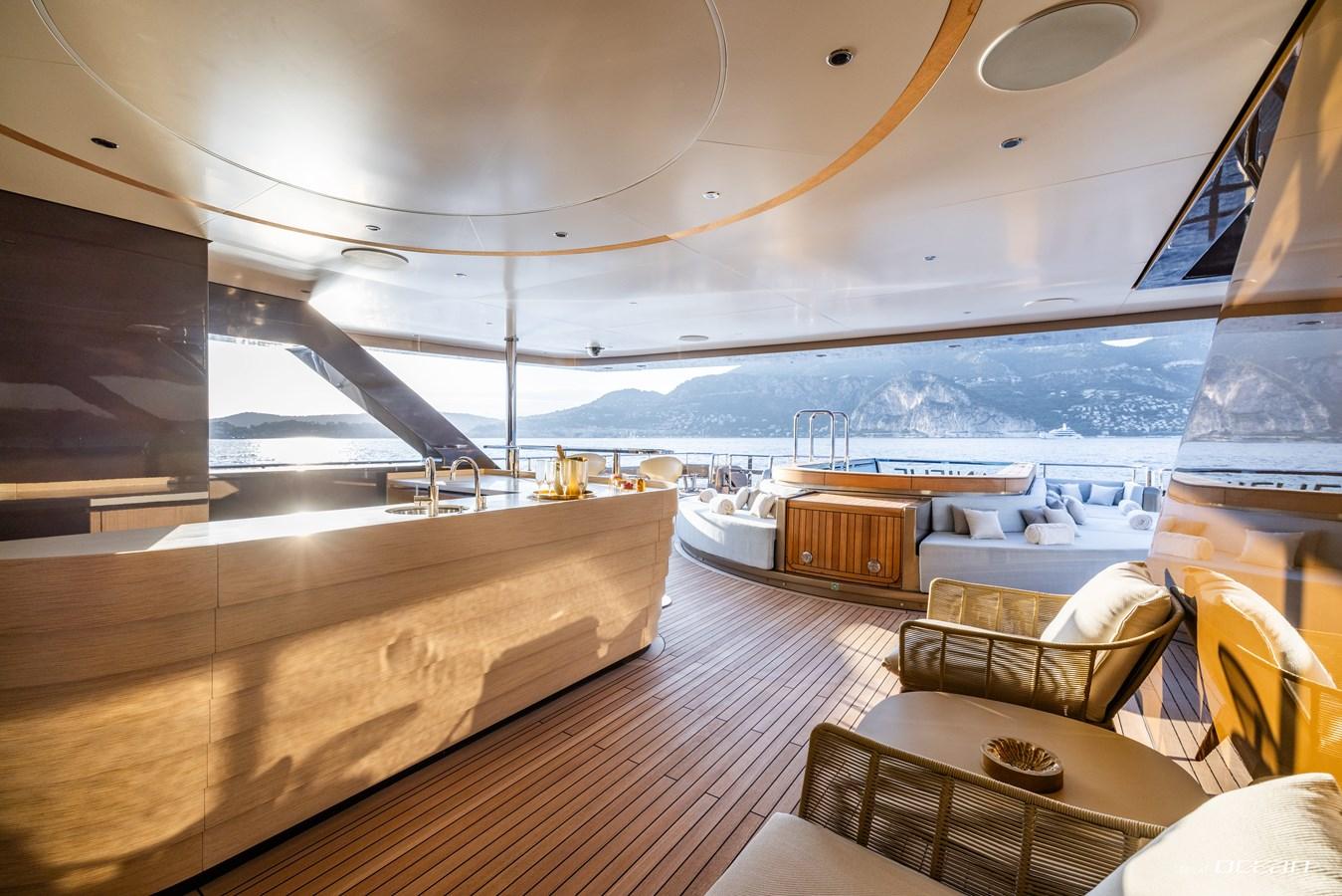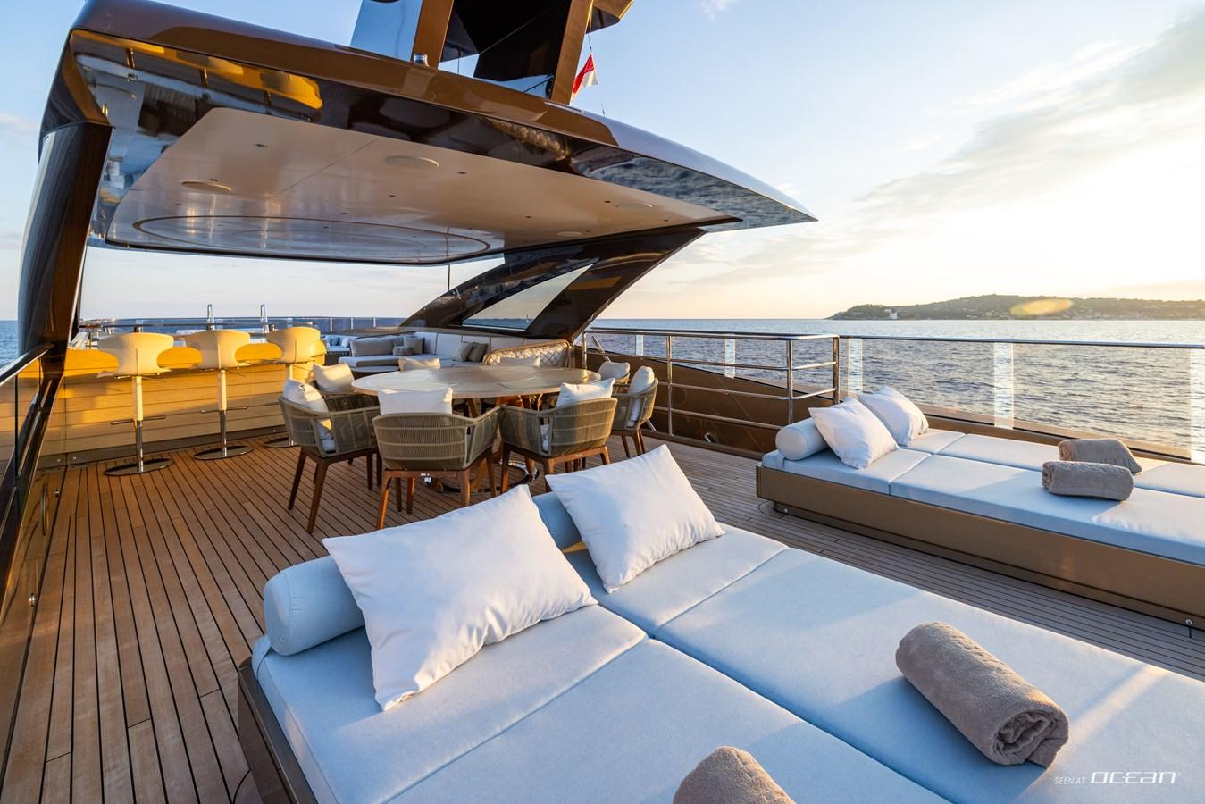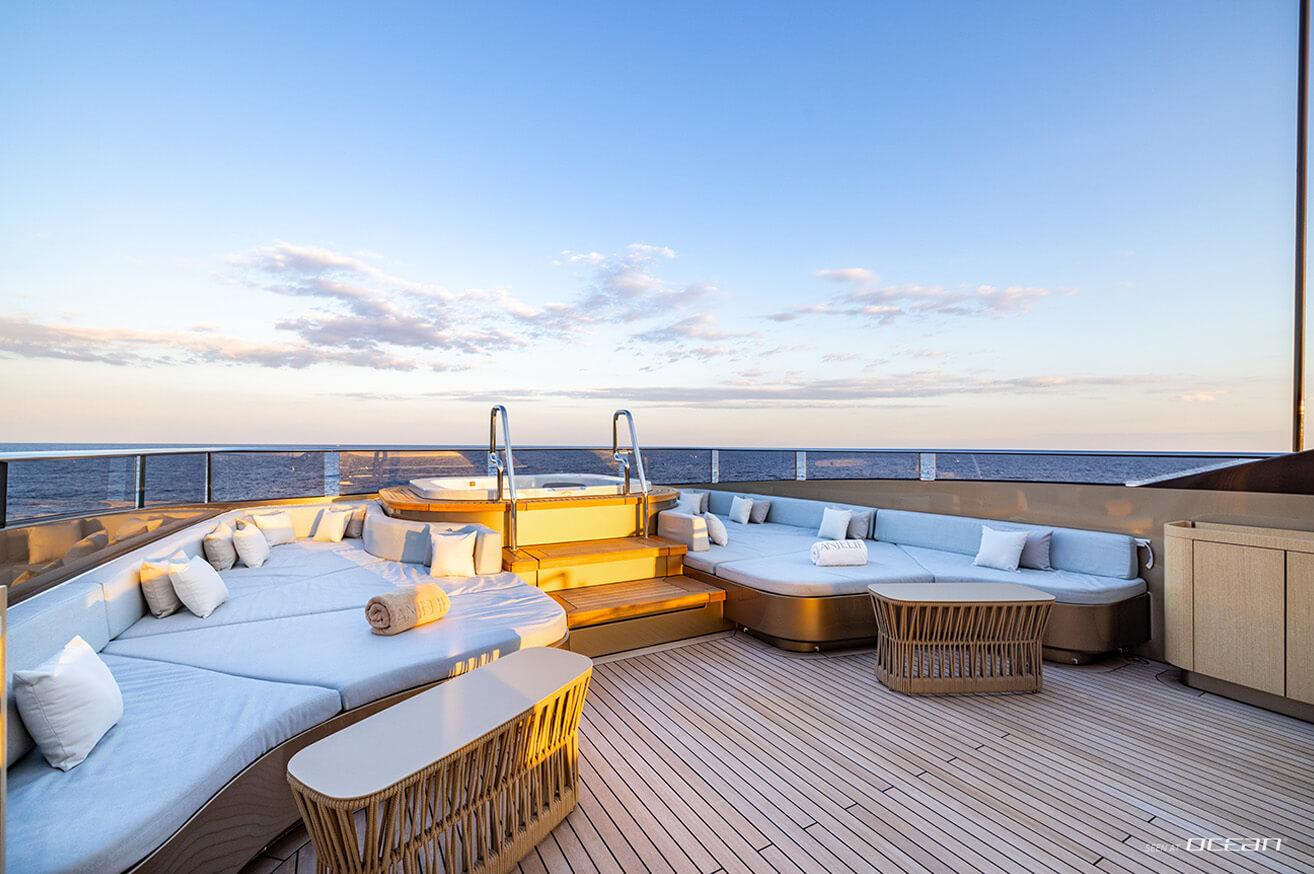 Life on board is shaped by a strong connection between interior comfort and outdoor living. A heated infinity pool aft, a panoramic flybridge jacuzzi, and an open-air cinema create a relaxed yet sophisticated setting, while expansive windows and natural materials define a calm and contemporary atmosphere throughout.