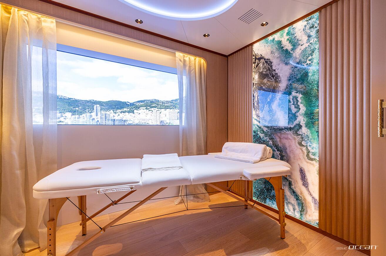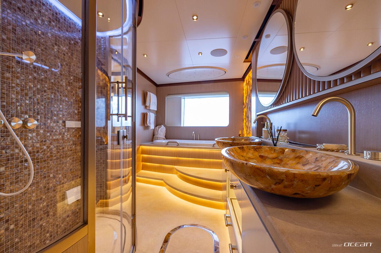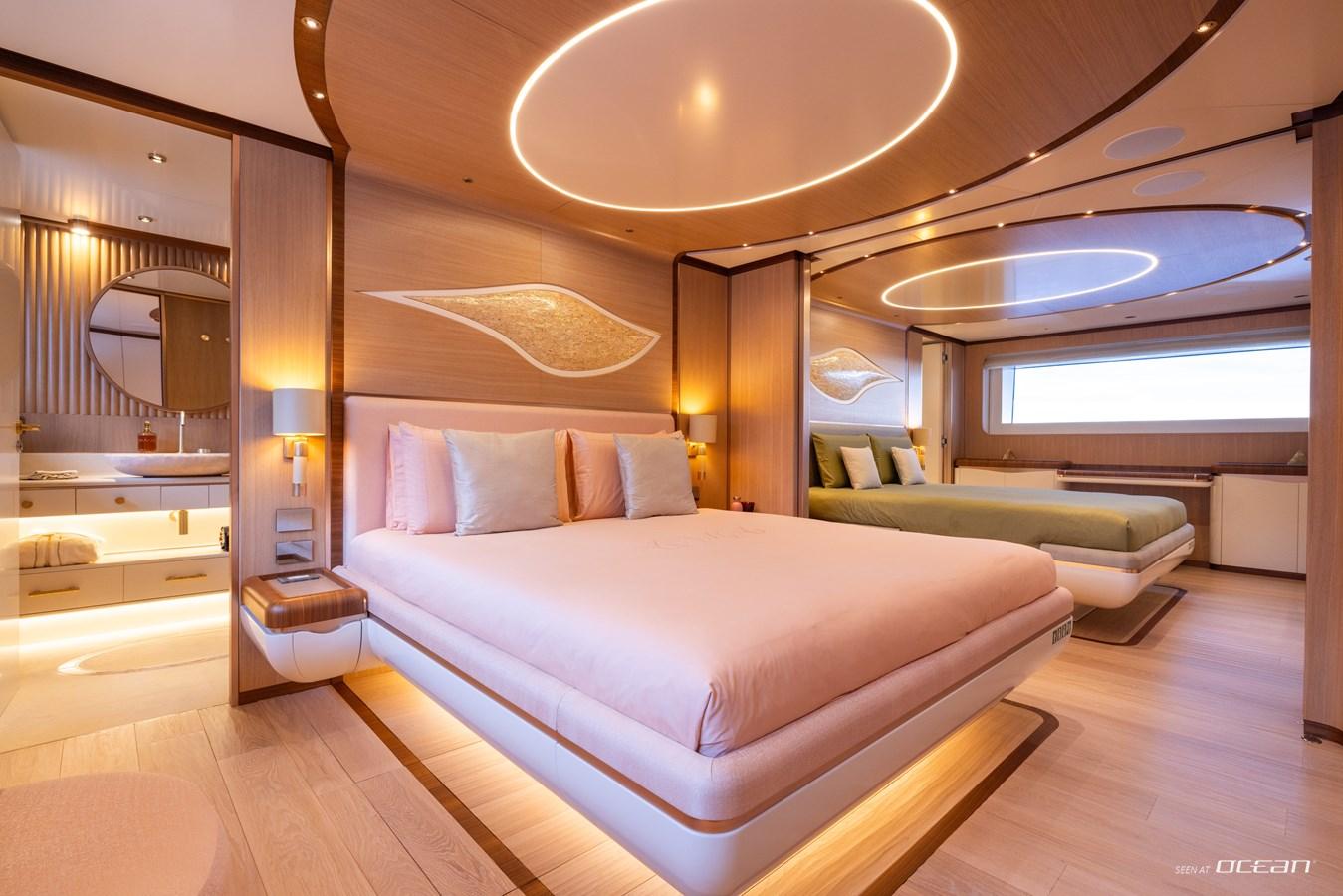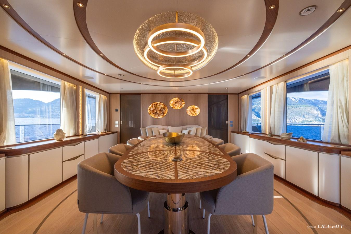Life on board is shaped by a strong connection between interior comfort and outdoor living. A heated infinity pool aft, a panoramic flybridge jacuzzi, and an open-air cinema create a relaxed yet sophisticated setting, while expansive windows and natural materials define a calm and contemporary atmosphere throughout.