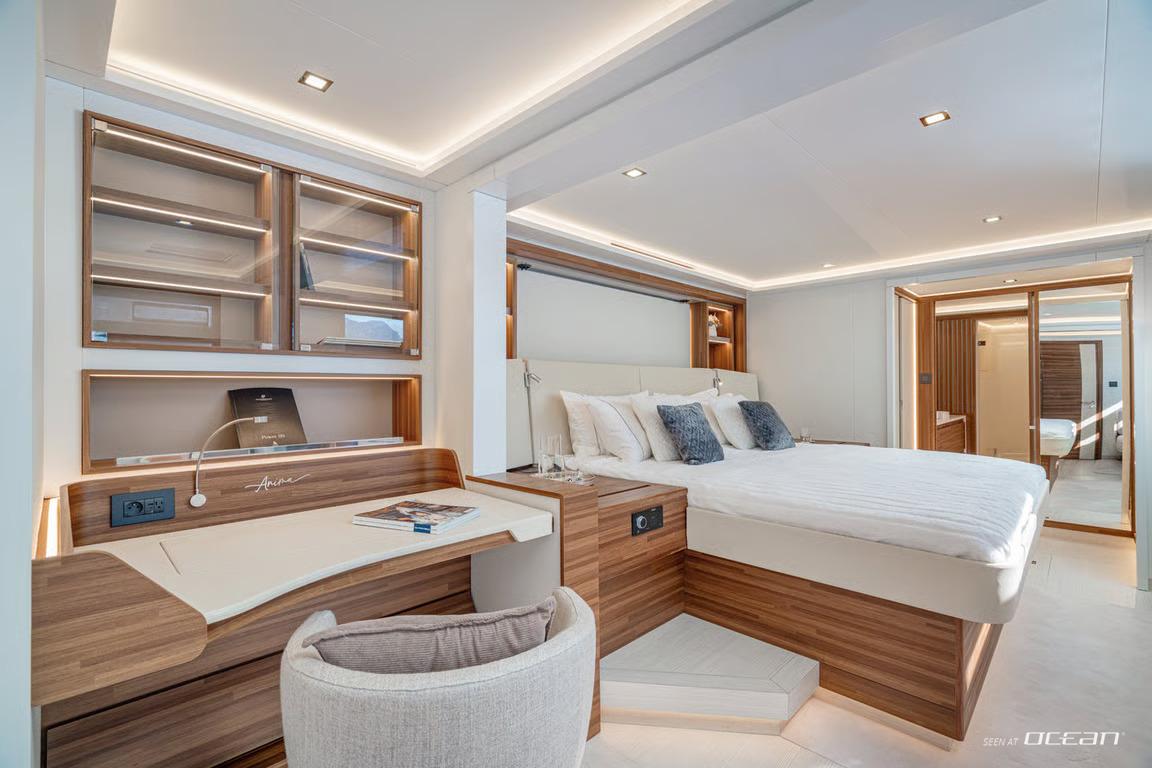 CAPRI accommodates up to 8 guests in 4 spacious cabins including a master stateroom, VIP suite, and 2 double cabins. Her expansive exterior decks include a large flybridge lounge, a foredeck terrace with Jacuzzi and sunpads, and a wide hydraulic swim platform for easy access to the water and launch of seabobs, skis, and assorted boards.