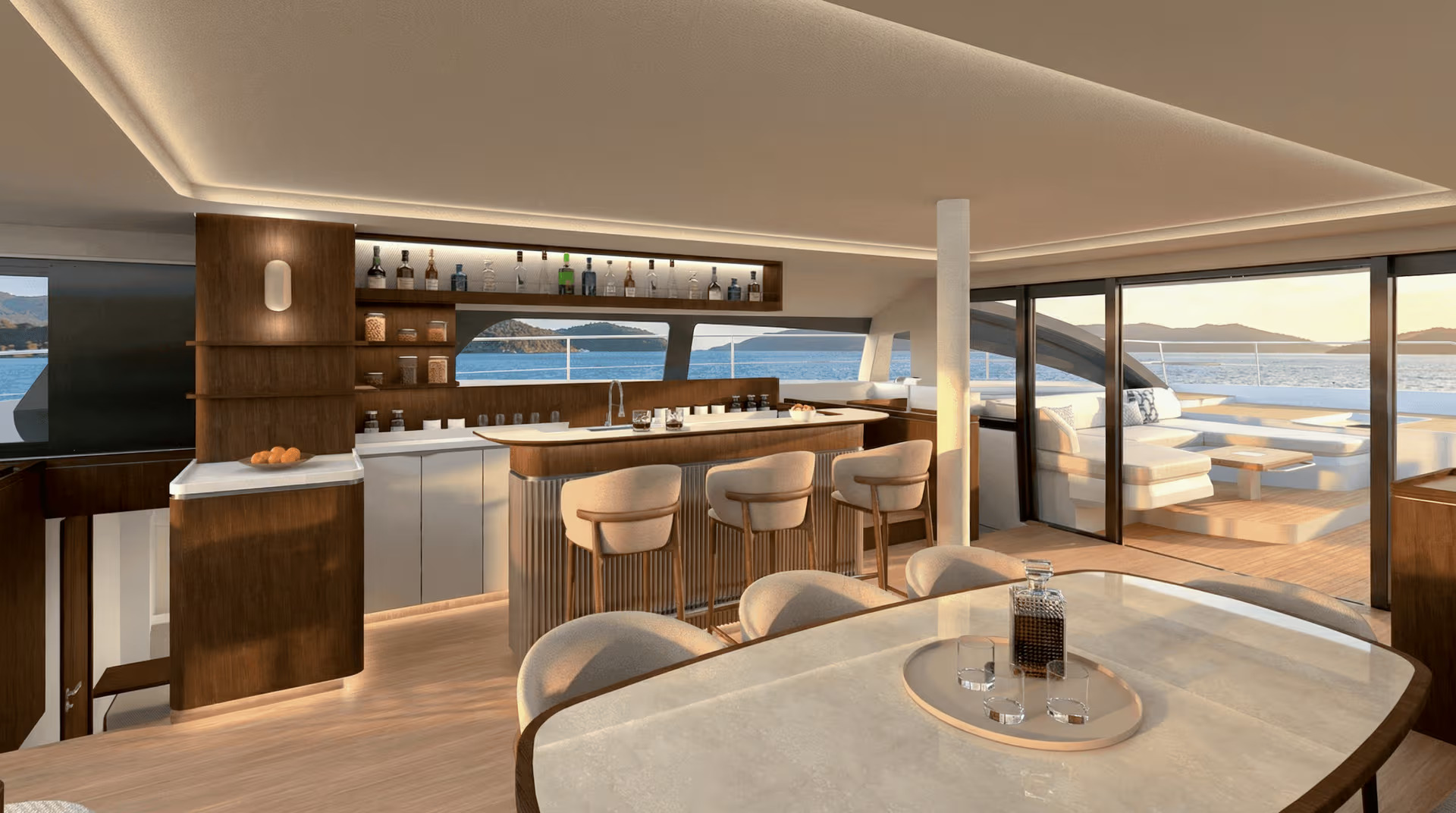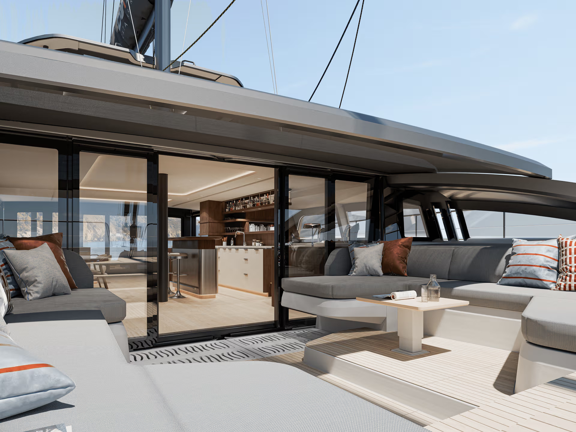 Developed at the shipyard’s headquarters in the South of France, the Bali 7.0 builds on the brand’s signature open-space philosophy, now scaled to supercat proportions. With her wide beam, substantial onboard volume, and seamless transitions between interior and exterior areas, she presents a layout designed for long-range comfort and social living. The recognizable up-and-over door is complemented by a forward glazed access, allowing a continuous walk-through experience from aft cockpit to foredeck, while expansive glazing enhances light and visibility throughout.