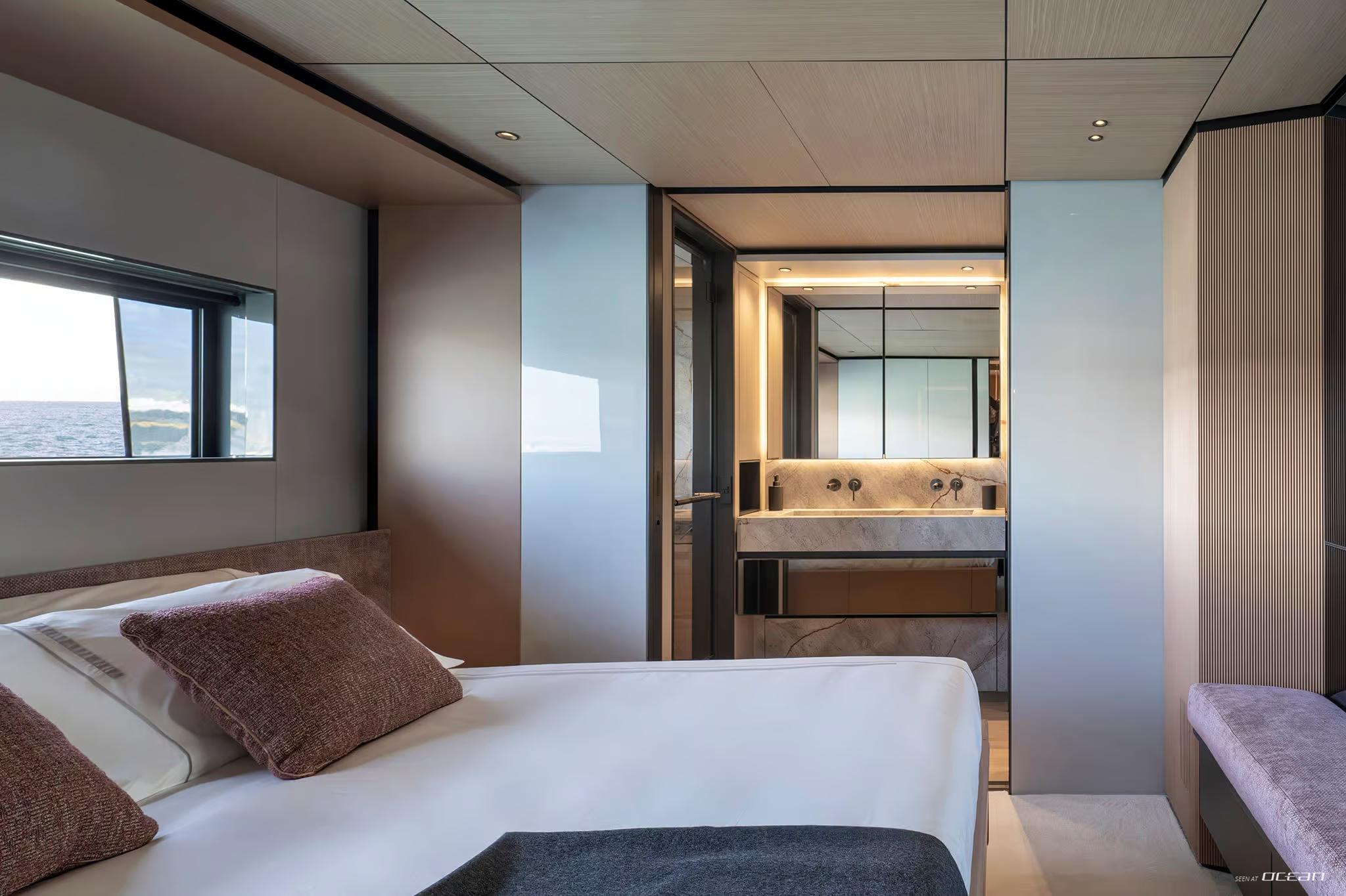 Accommodation aboard ILMA is arranged for up to 12 guests across 5 luxurious cabins, including a full-beam master stateroom on the main deck, 2 VIP cabins, and 2 convertible twin cabins with pullman beds. All cabins feature ensuite bathrooms, smart TVs with Apple TV, and Starlink internet, ensuring comfort, connectivity, and privacy throughout the charter. A professional crew of 6, including a skilled chef, delivers seamless service tailored to the expectations of the most discerning clientele.