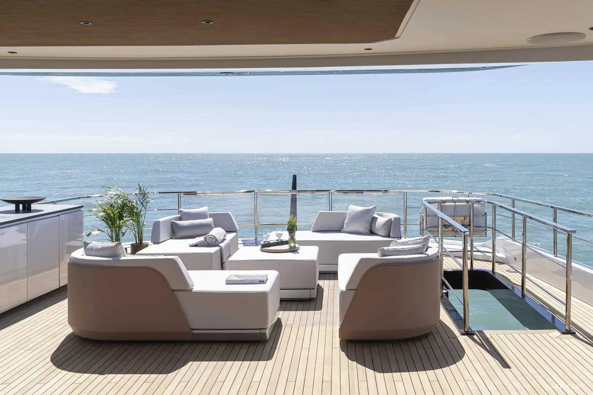 Outdoor living is central to the onboard experience. A spacious beach club, deck jacuzzi, and stabilizers underway and at anchor provide calm and comfort in all cruising conditions. A comprehensive selection of water toys, including a jet-ski, 3 Seabobs, boards with an e-foil and surfboard, and inflatable equipment, completes a lifestyle designed around enjoyment and flexibility at sea.