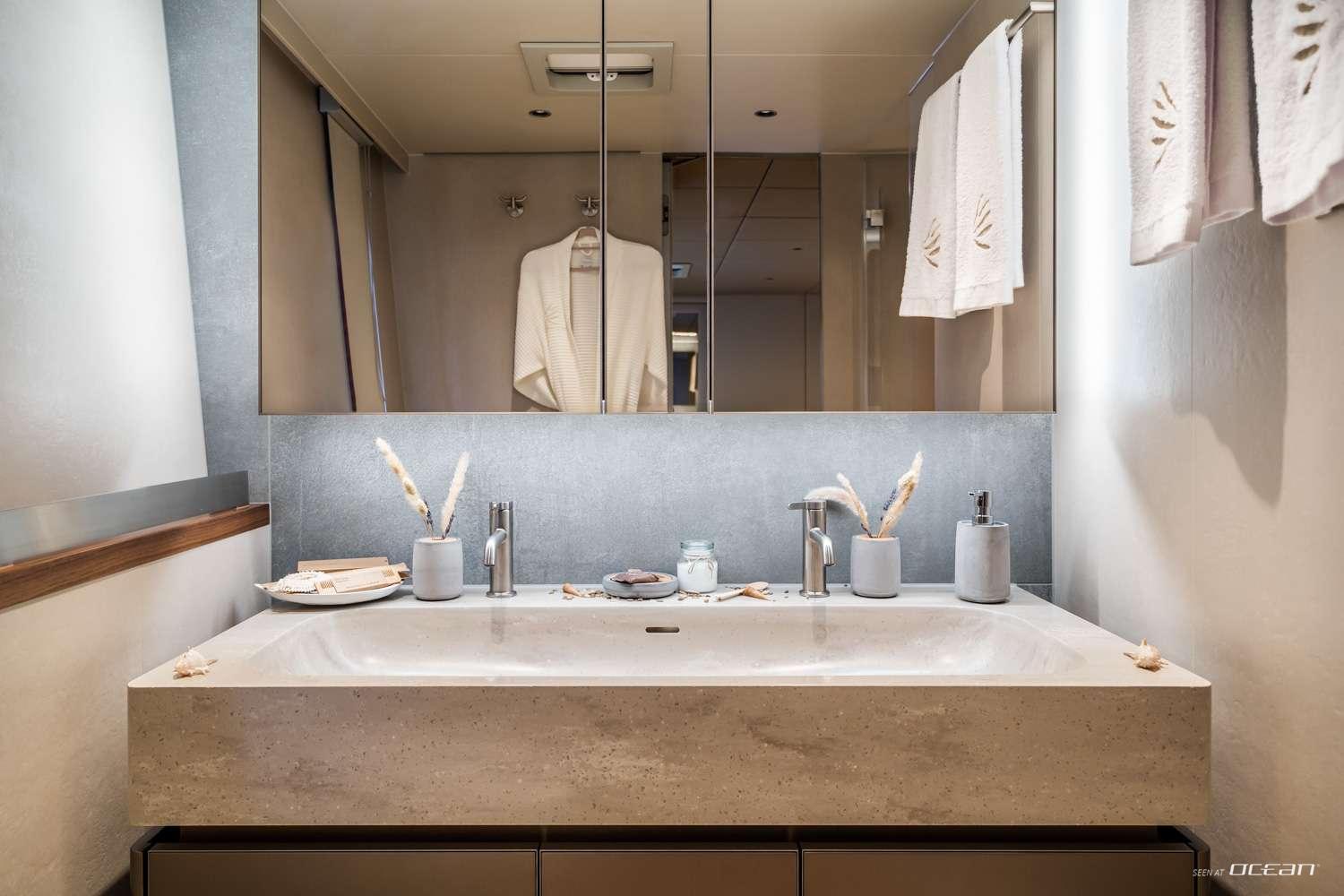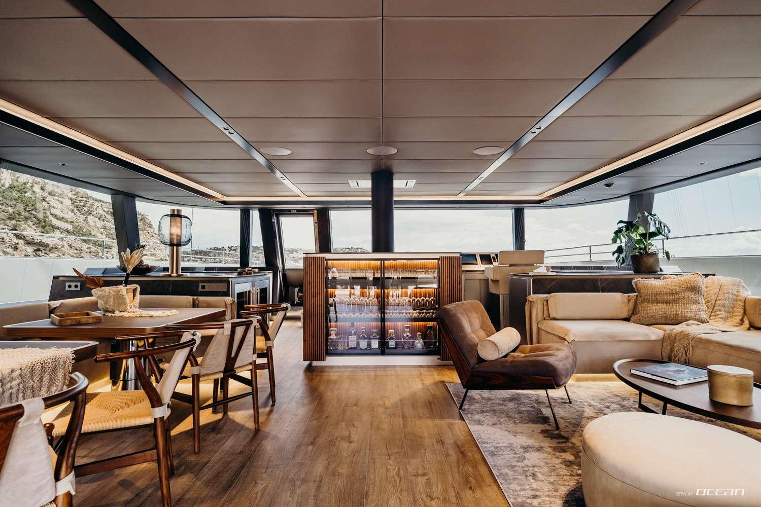 Her interior radiates warmth and tranquillity through natural materials, soft tones and expansive windows that flood the salon with light. Below deck, each suite has its own ensuite bathroom, ensuring privacy and comfort for families or friends sharing the adventure.